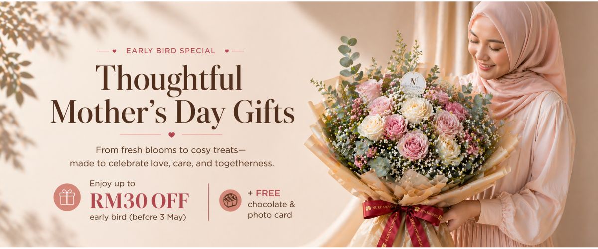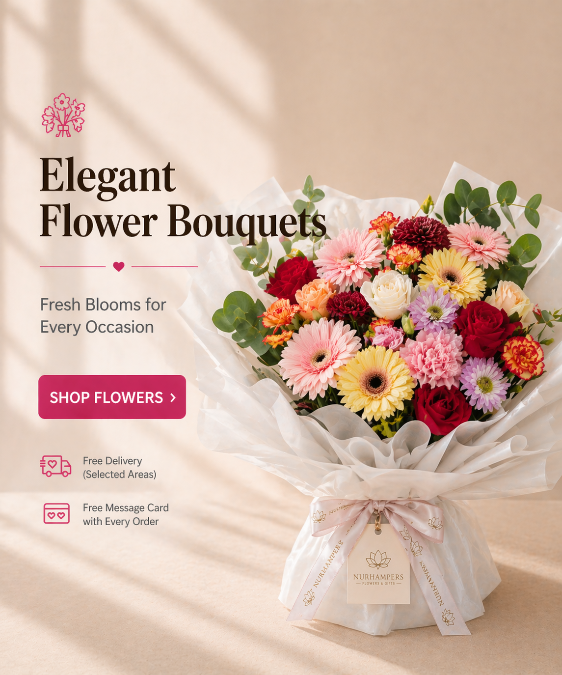 Nurhampers is an online florist located in Prima Saujana, Kajang . We source for the freshest and highest quality local flowers and imported flowers to design our bouquet within Klang Valley area. We specialize in bringing a modern and creative twist to our flowers and hamper products. We provide hampers and floral services to weddings, events, table arrangements, and vase arrangements.