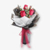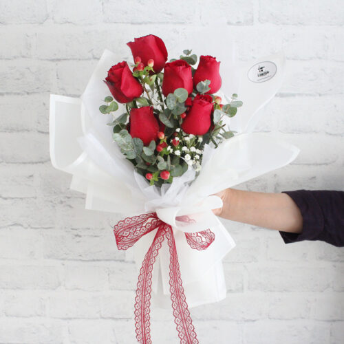 - Arrangement of: 6 red roses with plenty of red berry and eucalyptus leaves
