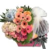 A glamorous and elegant fruit and flower basket, composed of generous bunches of Roses, Carnation, Stargazer Lily, Gerbera Daisy, Chrysanthemum, and Berry. Perfect well wishes gift basket.