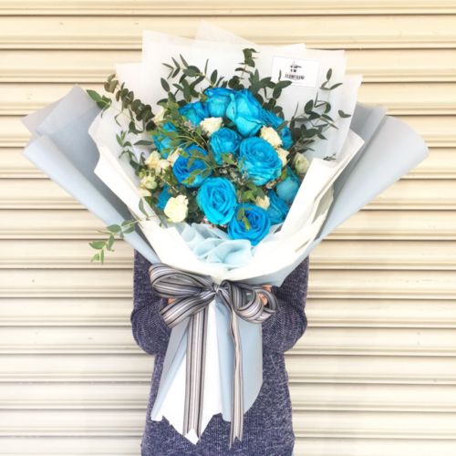 • Arrangement of: 12x Blue roses, 10 x Champagne spray rose and plenty of eucalyptus.• Suitable for all occasions. • Free Mini Message Card • Available for delivery within Klang Valley only.