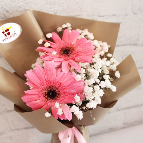 • Arrangement of: 2 Gerbera and a plenty of Pink Baby Breath