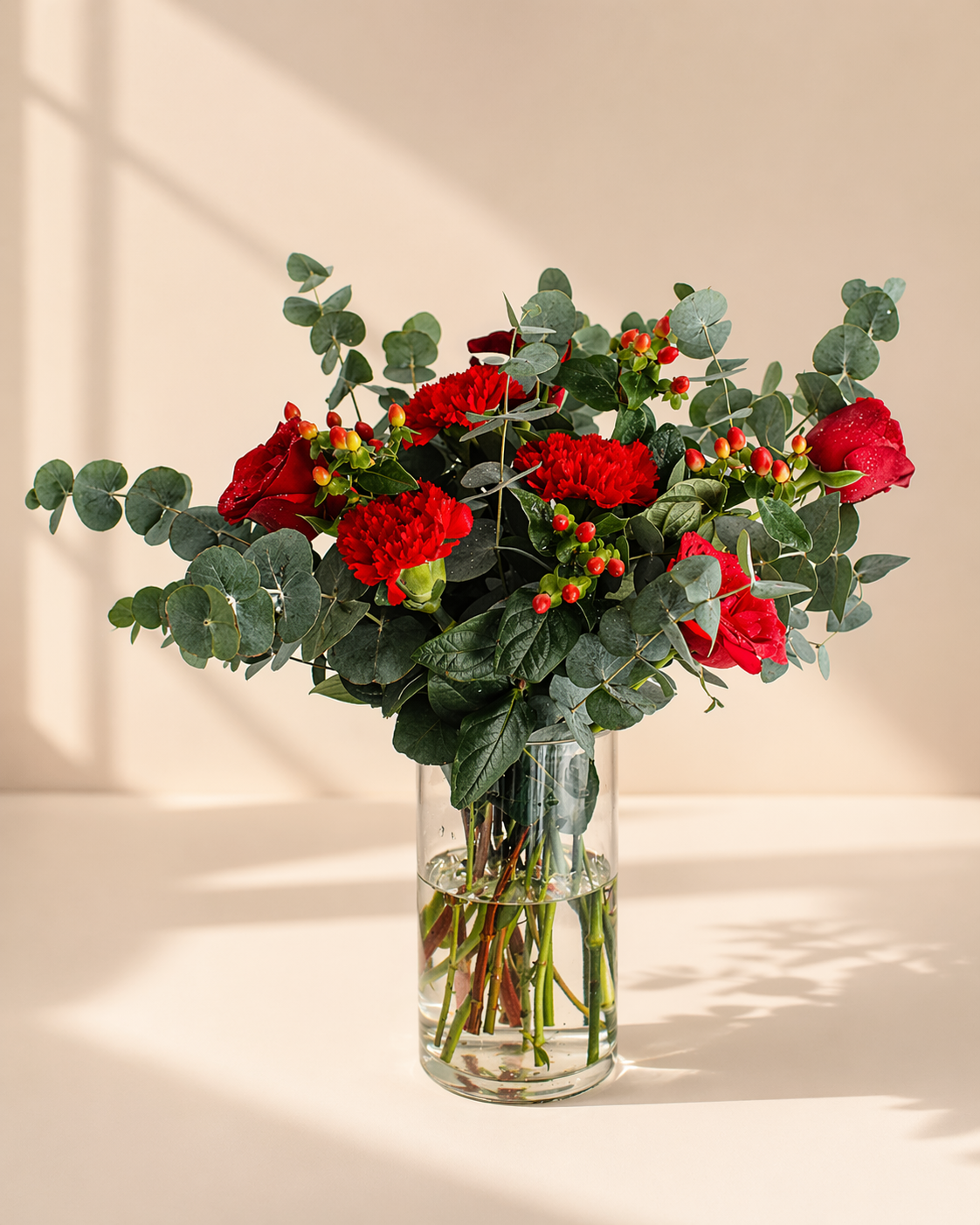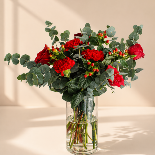 The Crimson Bloom Vase Arrangement showcases a striking combination of fresh red flowers paired with natural greenery, beautifully styled in a clear glass vase. Its rich tones and modern presentation create a powerful yet elegant statement, perfect for making any moment memorable.