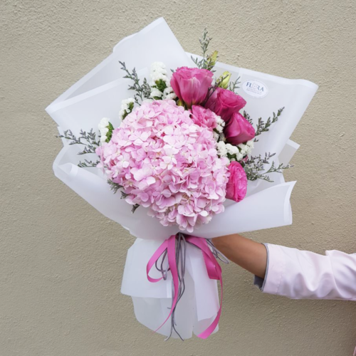 A beautiful arrangement of pink hydrangea, pink Eustoma, statice, and Caspia suits someone special in your heart. The arrangement is perfect to symbolize heartfelt emotions towards your lover.