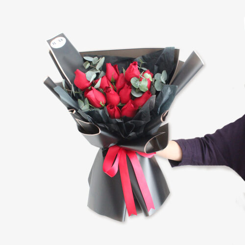 - Arrangement of: 12 red roses with plenty of eucalyptus leaves