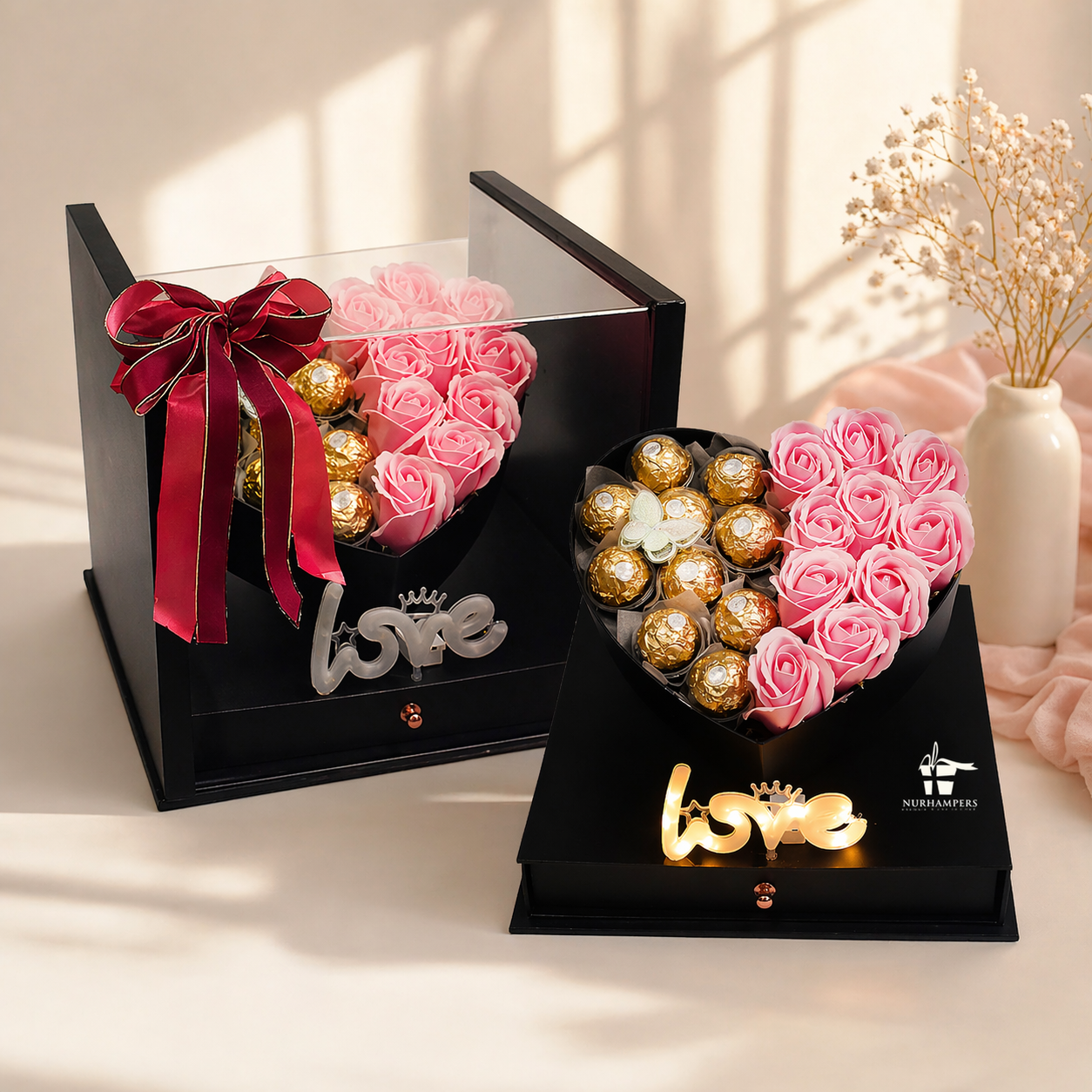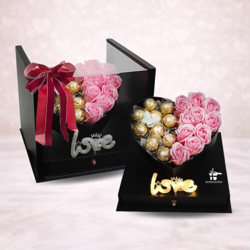 This box shows a heart shape with soft pink roses. It comes with smooth and rich chocolate treats. Soft LED light gives a warm and calm glow. The clear box looks neat and clean.