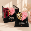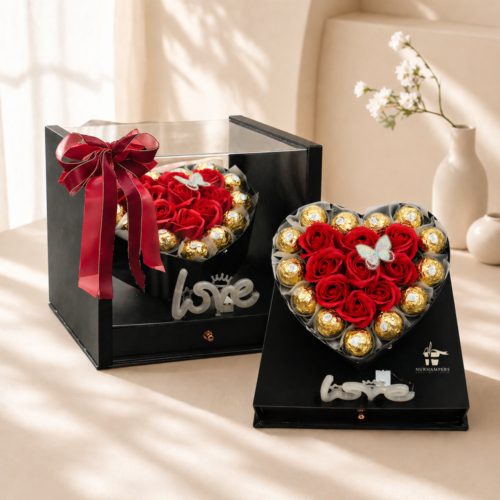This box shows red roses in a heart shape. It comes with smooth and rich chocolate treats. Soft LED light gives a warm and calm glow. The clear box looks neat and premium.