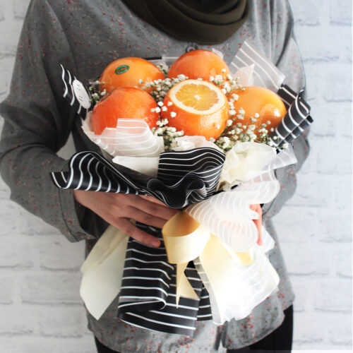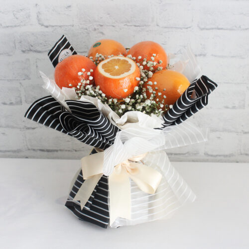 Hand-arranged with fresh & juicy orange bouquet paired with a baby breath. Our Naura Citrus Bloom fruit bouquet is sure to bring on the brightest of smiles and a whole lot of sweet sunshine to your loved ones’ day.