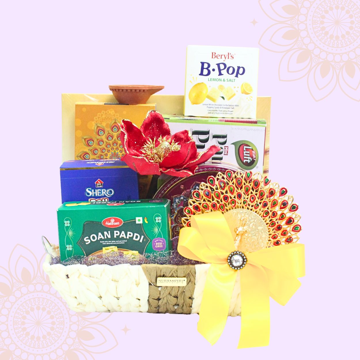 Celebrate Diwali with an elegant jute tray, filled with sweets and treats for a touch of festive indulgence.