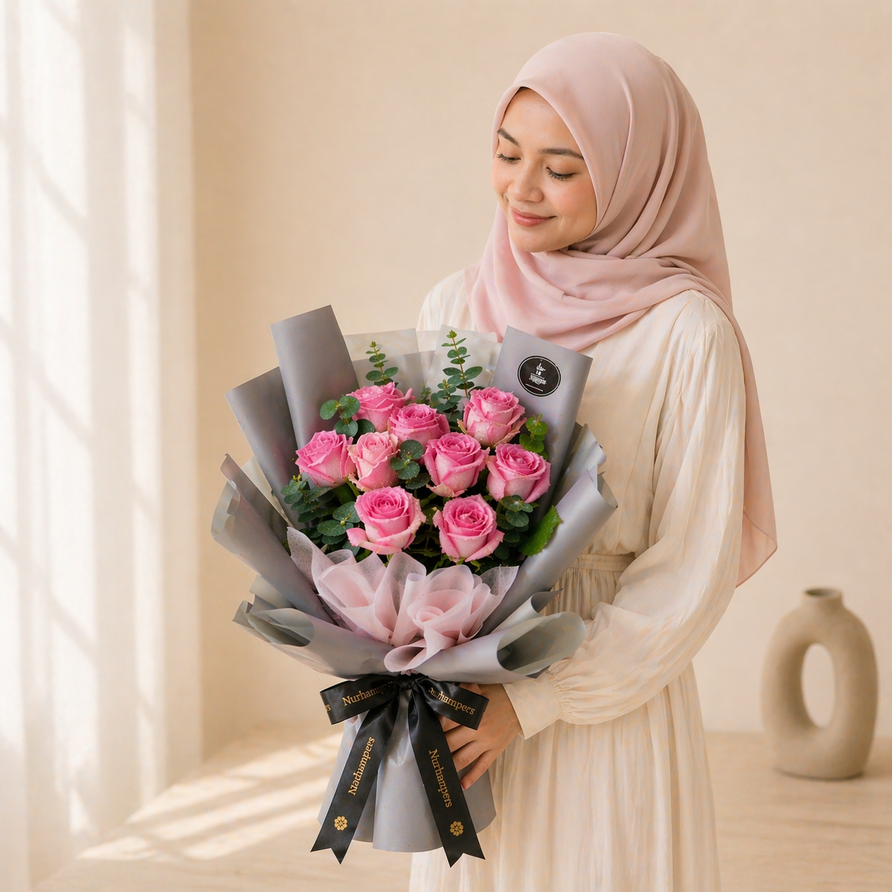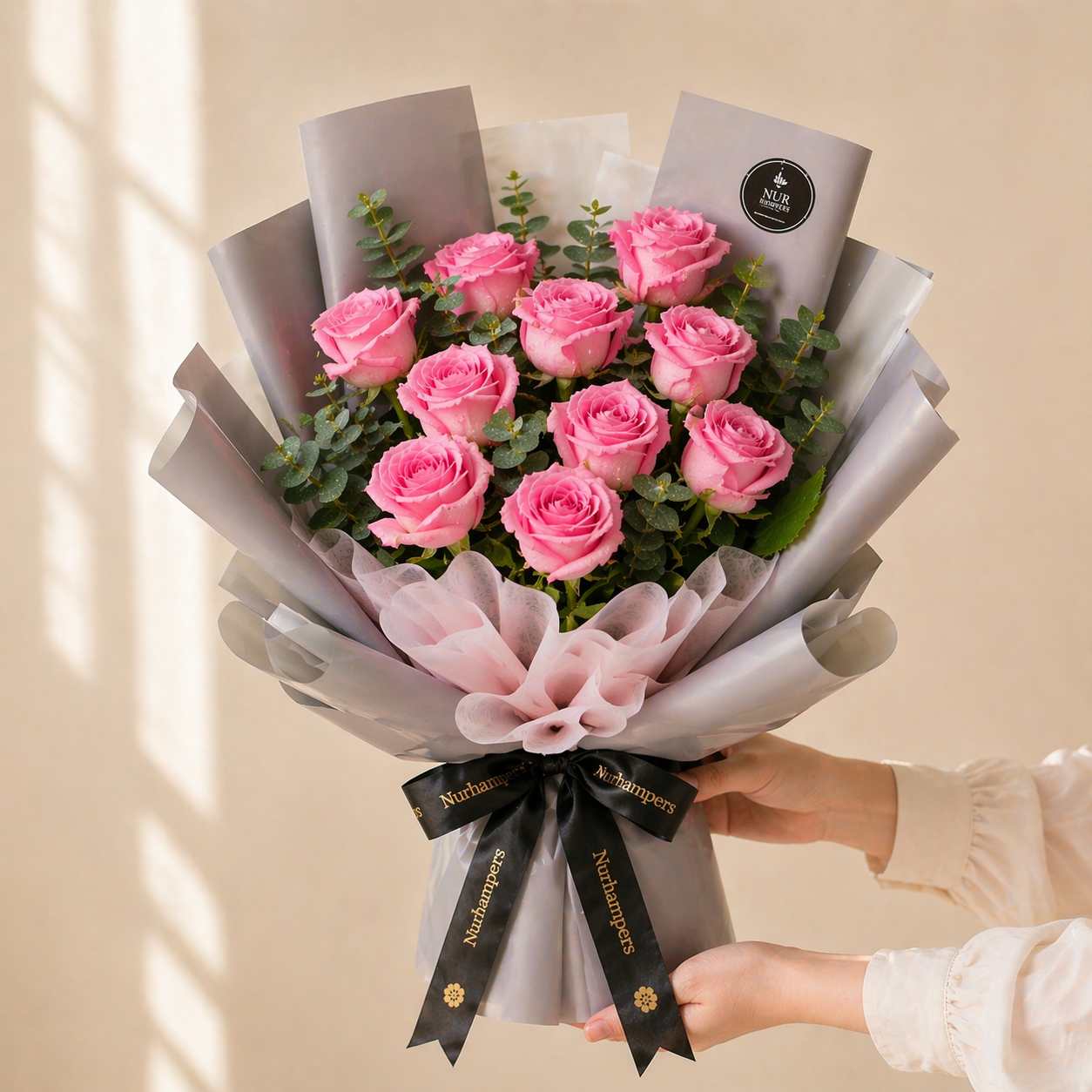 The Pink Seduction Rose Bouquet features a stunning arrangement of fresh pink roses, carefully styled in a modern and elegant wrapping. Symbolising admiration, sweetness, and affection, this bouquet is designed to leave a lasting impression on any special occasion.