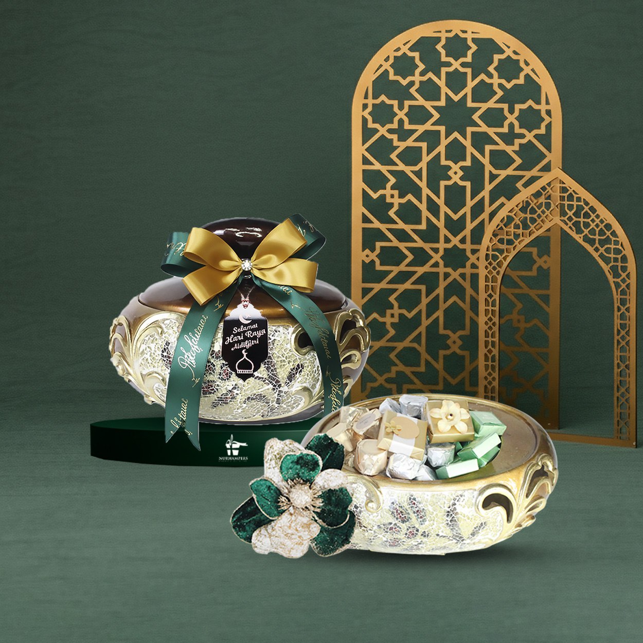 Celebrate Hari Raya with an elegant porcelain covered bowl filled with premium 345g Patchi chocolates, a luxurious festive gift that doubles as a beautiful keepsake display.