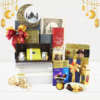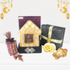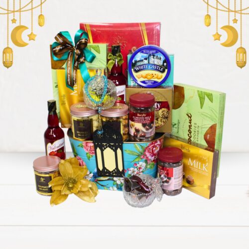 A delightful Raya hamper with traditional cookies, premium chocolates, and mango syrup, elegantly presented in a floral metal basket. Perfect for gifting!