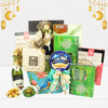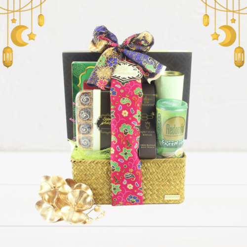 Premium Hari Raya hamper with homemade cookies, chocolates, and tea in a handwoven rattan basket. Perfect for gifting!