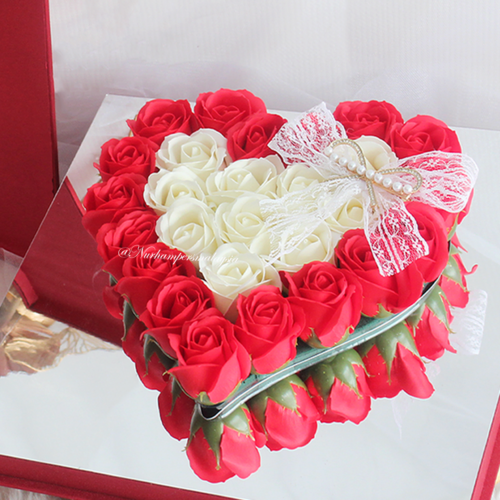 Combination Red & White Rose Scented Soap Flower 27/28 stalks. Presented elegantly in a acrylic transparence box – fit for that burning love of your life.