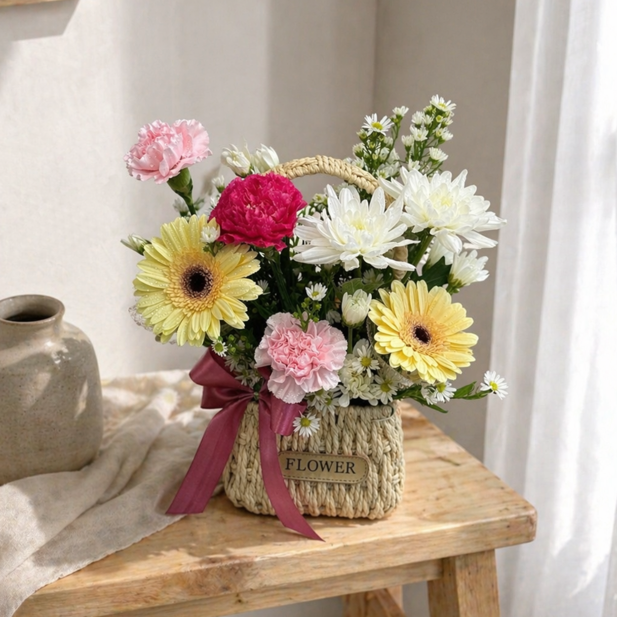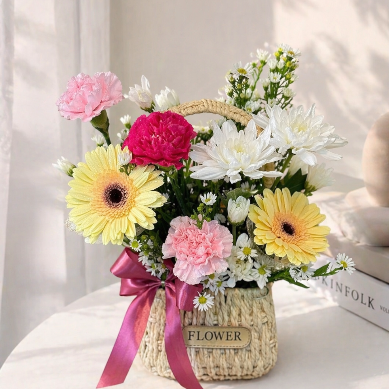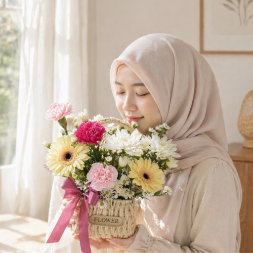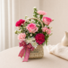 This basket shows soft colors and fresh flower beauty. Each bloom is picked to feel warm and calming.